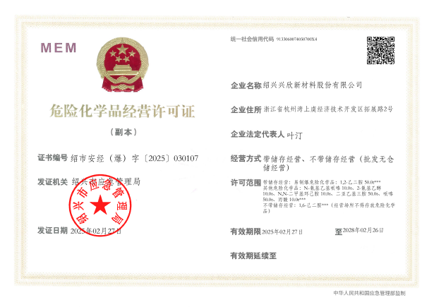 紹興興欣新材料股份有限公司成立于2002年06月27日,占地面積122畝,位于杭州灣上虞經(jīng)濟(jì)技術(shù)開發(fā)區(qū)拓展路2號(hào),現(xiàn)有職工200余人,專業(yè)技術(shù)人員50余人;博士、碩士研究生30余人組成的一支知識(shí)型、專業(yè)化的技術(shù)科研團(tuán)隊(duì)。公司面向全球市場,專業(yè)開發(fā)電子化學(xué)品、環(huán)保化學(xué)品、醫(yī)藥中間體、高分子材料等先進(jìn)新材料重點(diǎn)領(lǐng)域的省級(jí)科技型企業(yè);建有浙江上虞、安徽東至兩個(gè)生產(chǎn)基地。目前為“國家高新技術(shù)企業(yè)”、浙江省“隱形冠軍”企業(yè)、浙江省專精特新中小企業(yè);建有“省級(jí)”研究開發(fā)中心,共建天津大學(xué)浙江紹興研究院電子化學(xué)品研發(fā)中心。